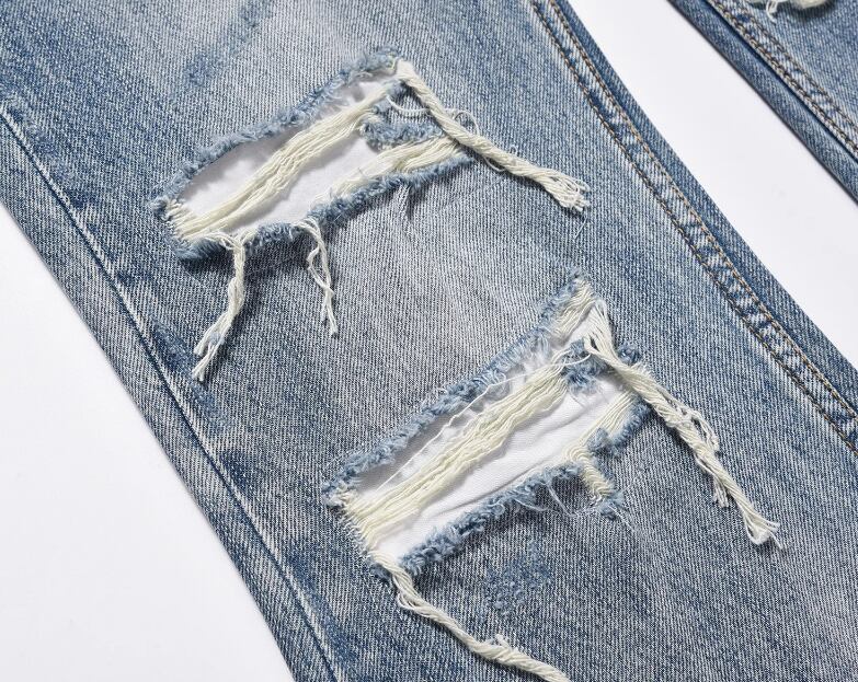 大胆に施された破れ加工と、絶妙な色落ちがトレンド感を演出します。