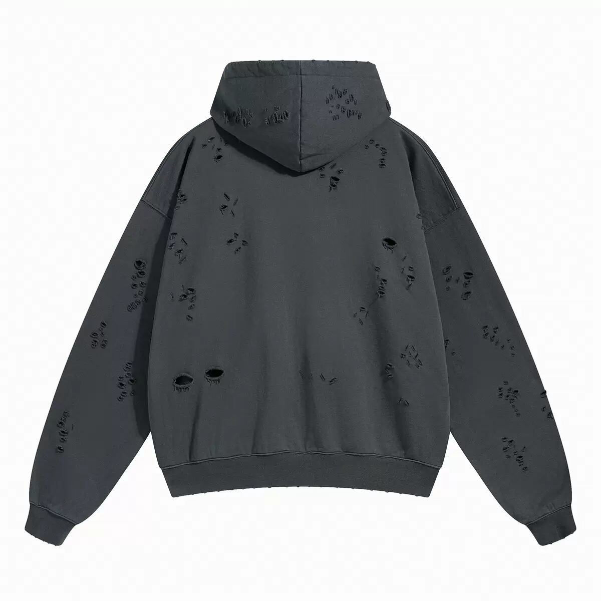 トレンド感あふれるダメージ加工を施したオーバーサイズのフーディ。